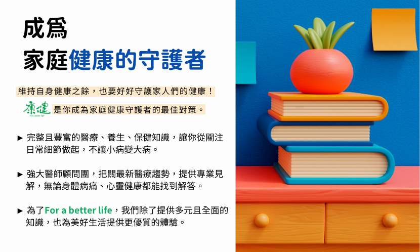 《康健雜誌》創刊至今25週年,希望與每個人生活緊密串連推廣健康常識,特別著重於醫療趨勢、心靈關係、健康飲食、自然養生、休閒品味、大人的社團等主題,不單單是知識,更為美好生活提供最優質的體驗,打造獨具品味與樂活態度的生活方式,帶來最好的改變。