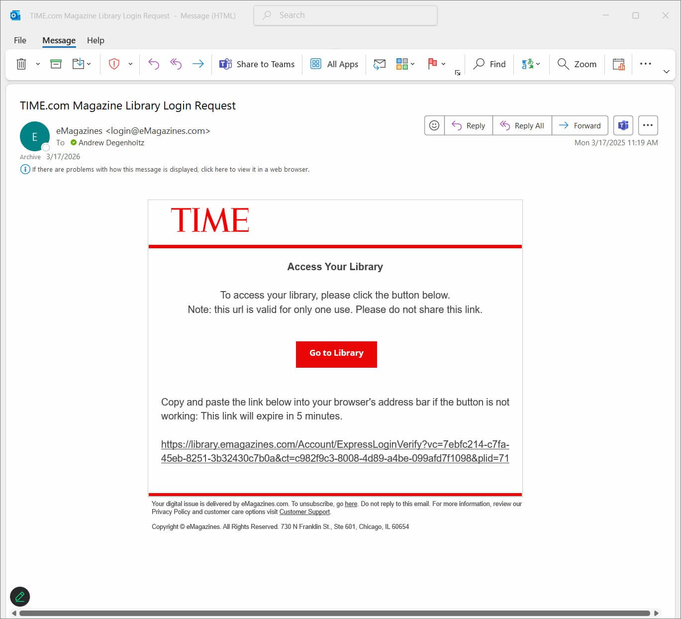 - 該電子郵件將來自發性件人login@emagagazines.com 。如果他們沒有收到電子郵件,訂閱者可以嘗試在自己的電子郵件帳戶中將此電子郵件地址新增為安全寄件者清單/白名單。如何執行此操作將因電子郵件提供者而異,但作為範例,以下是 Gmail 的說明https://emagazines.zendesk.com/hc/en-us/articles/115002249992-How-do-I-whitelist-eMagazines-Gmail